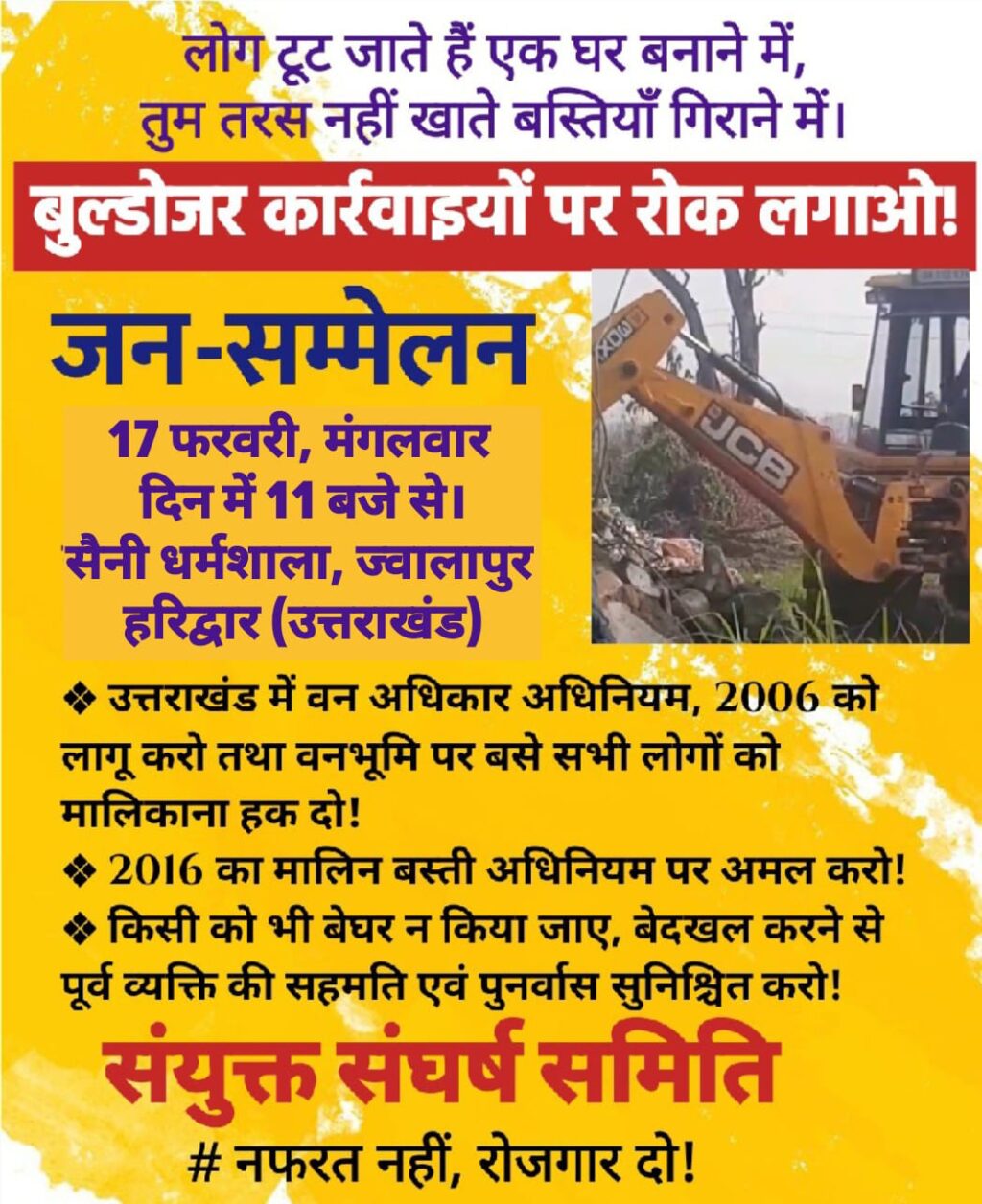 उत्तराखंड राज्य में पहली बार शहरी एवं ग्रामीण लोग एक साथ आ कर सरकार की गैर कानूनी, जन विरोधी बेदखली कार्यवाही पर आवाज उठा रहे हैं। उत्तराखंड में वन अधिकार कानून 2006 को लागू करने तथा वनभूमि पर बसे सभी लोगों को मालिकाना हक दिये जाने, 2016 का मालिन बस्ती अधिनियम पर अमल करने तथा किसी भी व्यक्ति को बेदखल किए जाने से पूर्व उसकी सहमति के साथ उसका पुनर्वास सुनिश्चित किये जाने आदि मांगों को लेकर संयुक्त संघर्ष समिति द्वारा आगामी 17 फरवरी को सैनी धर्मशाला हरिद्वार में जन सम्मेलन का आयोजन किया जाएगा।